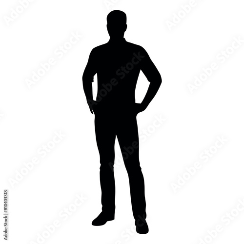 vector silhouette of a man dressed in a shirt and jeans standing with hands on hips, side view