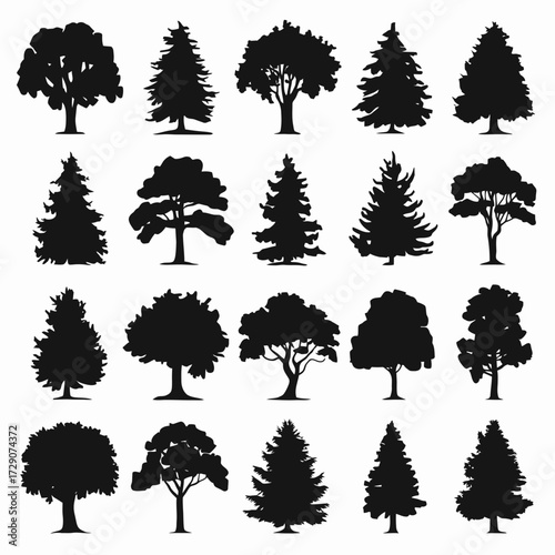 Vector silhouette tree collection diverse forest woodland elements scalable graphics silhouette white background
