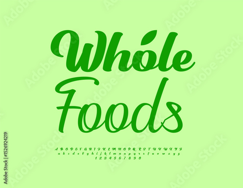 Vector Stylish label Whole Foods. Eco Green Font. Minimal Cursive Alphabet Letters and Numbers set.