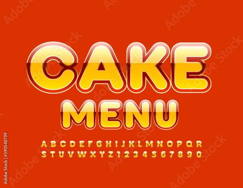 Vector sweet template Cake Menu. Shiny luxury Font. Bright Alphabet Letters and Numbers set