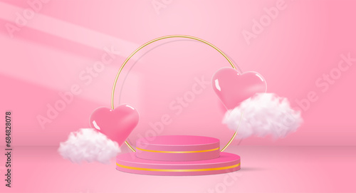 Vector valentines day with 3d cylinder pedestal podium with gold, heart and cloud. Realistic Vector Illustration