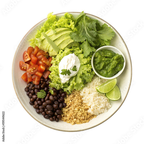 Vegan Burrito Bowl Salad on a plate - romaine lettuce, brown rice, black beans, salsa, guacamole, vegan sour cream