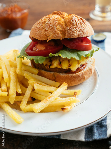 vegan, burger, fries, freshness, french fries, food, homemade, vegetarian, vegetable, tomatoes, ready-to-eat, pineapple, meal, lunch, homemade, healthy, fruit