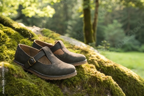 vegan, shoe, leather, alternative, mossy, rock, forest, floor, nature, scene, footwear, sustainable, fashion, greenery, tranquil, setting, natural, light, low, resolution, display, summer, day, casual attire, style, environmental, consciousness, timberland, organic, material, rustic, charme, environment, relaxing, moment, path, soft, lighting, fashionable, trend, green, living, escape, elegance, generative, ai