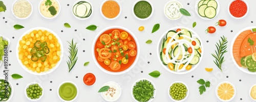 vegan, meal, variety, dish, flat, design, illustration, receipe, mealtime, class, diet, cookery, show, book, epicure, produce, comfort, culture, epicure, fusion, snack, tip, healthy, plan