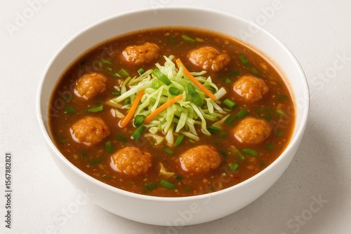 Vegetable garnished Chicken Manchurian soup served in a white bowl with a textured background