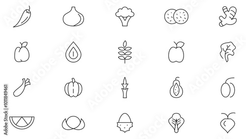 vegetable, fruit, food, organic, outline, tomatoes, banana, onion, pineapple, strawberry, cherry, icon, grape, carrot, pear, watermelon, broccoli, vegetarian, set, avocado, cucumber, line, pomegranate, berry, horizontal, pictogram, collection, corn, freshness, healthy, eating, ingredient, thin, cabbage, natural, salad, plant, pumpkin, radish, garlic, mushroom, celery, kohlrabi, lettuce, chili, pepper, paprika, spinach