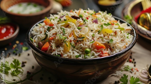 Vegetable pilaf displayed against a vibrant backdrop