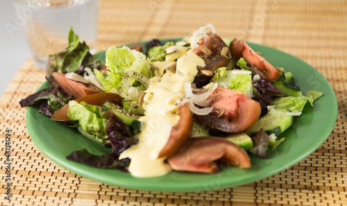 vegetable salad of greens, tomatoes and cucumbers on a green plate