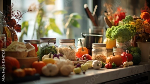vegetable, blurred, autumn, interior, design, illustration, kitchen, countertop, fruit, pumpkin, apple, gourd, stove, pot, soup, warm, lighting, spice, welcoming, comforting, atmosphere, seasonal, movement, activity, cosy, home, decor, fall, harvest, rustic, modern