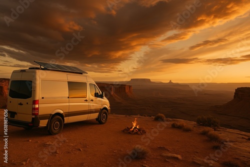 van, sunset, campfire, desert, landscape, vehicle, nature, adventure, travel, sky, cloud, warm, evening, scenic, horizon, exploration, camping, solitude, calmness, wilderness, environment, relaxation, journey, freedom, scenic view, rugged, terrain, solar, energy, remote, peaceful, atmosphere, fire, warmth, open space, natural, beauty, dusk, illumination, escape, serenity, immensity, lifestyle