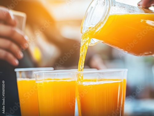 Vendor pouring freshsqueezed orange juice into cups for passing customers, fresh market, juice stand, refreshing
