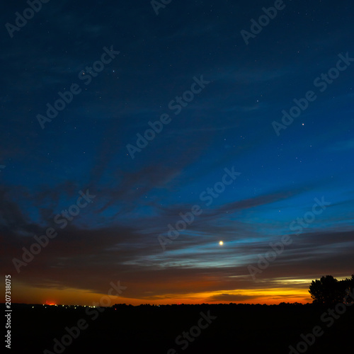 Venus in the night sky with stars. A bright sunset with clouds. Cosmic space above the earth's surface. Long exposure.