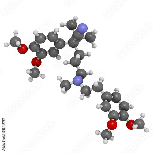 Verapamil calcium channel blocker drug. Mainly used in treatment of hypertension (high blood pressure) and cardiac arrhythmia (irregular heartbeat).