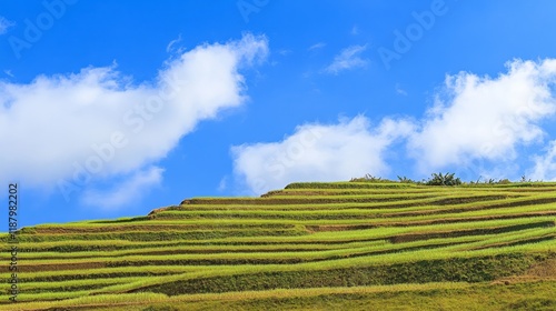 Verdant rice terraces under clear blue sky with fluffy clouds
