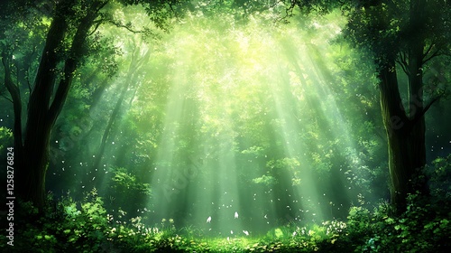 Verdant Woodland Serenity Sunlight Bursting Through Canopy Creating an Ethereal Mystical Atmosphere