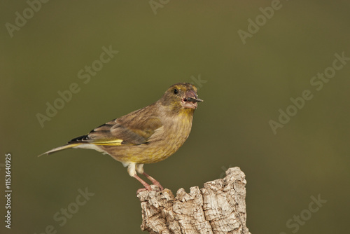 verderón europeo o verderón común​ (Chloris chloris)​ posado en un tronco