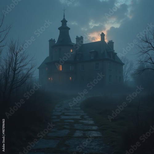verlassene Villa bei Dämmerung in nebliger Umgebung