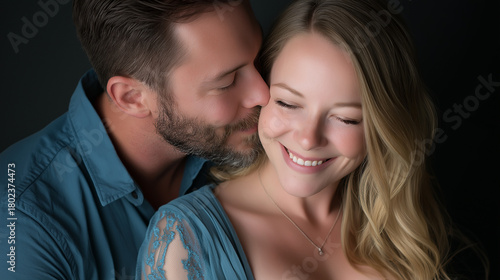 Verliebtes Paar in inniger Pose vor dunklem Hintergrund mit geschlossenen Augen