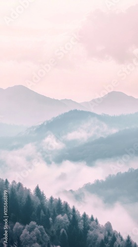 vertical illustration of a serene mountain landscape enveloped in fog, featuring soft pastel colors
