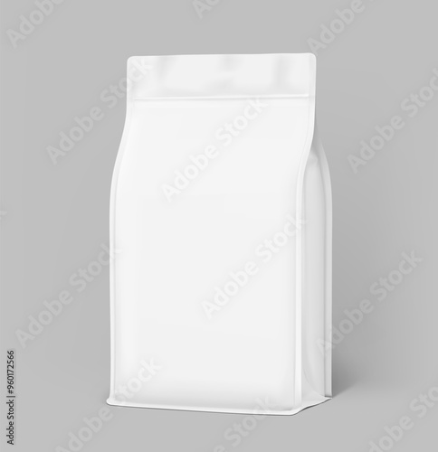 Vertical bag mockup. Flat bottom gusset bag. Half side view. High realistic. Vector illustration isolated on grey background. Ready for use in presentation, promo, advertising and more. EPS10.
