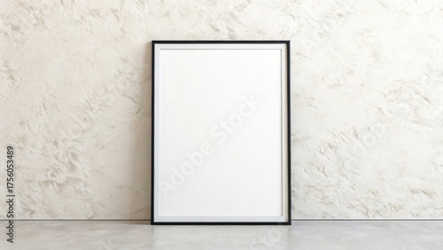 Vertical black picture frame against a textured wall on a concrete floor