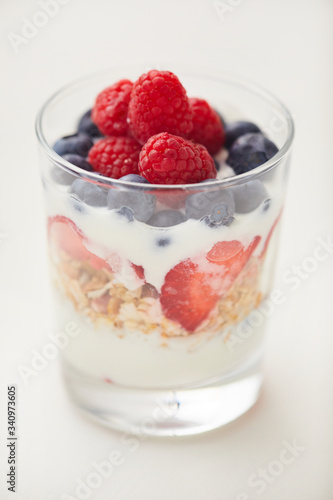 Vertical close up of delicious yogurt parfait cup with fresh berries and granola isolated on white background