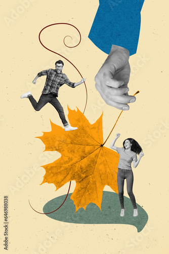 Vertical collage image of big black white effect arm fingers hold fallen maple leaf two mini people jump raise fists isolated on beige background