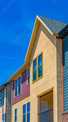 Vertical Exterior view of houses with balcony and multi colored wall