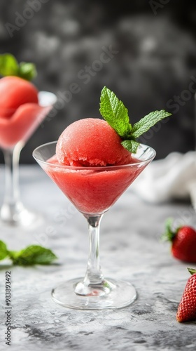 vertical format, Refreshing strawberry sorbet served in elegant glasses garnished with mint leaves on a marble surface