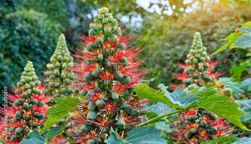 vertical image of carmencita castor bean ricinus communis carmencita plants with foliage and seedpods in a garden setting