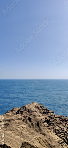 Vertical landscape of onlooking blue ocean from a rocky dusty cliff