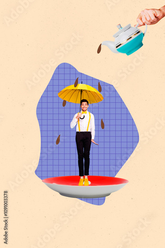 Vertical photo collage of happy man hold umbrella hand pour coffee americano drop rainfall autumn cyclone isolated on painted background