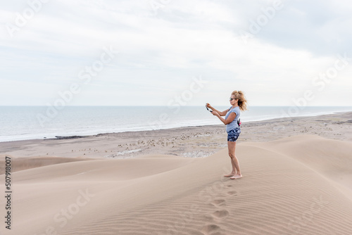Vertical photo of a woman with sunglasses using a portable tripod to take a selfie in a dune
