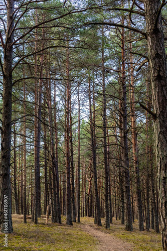 Vertical photo of small pathway covered with pine corns leads to forest between high pine tree trunks during spring day. Sunny and silent day at pine tree forest.