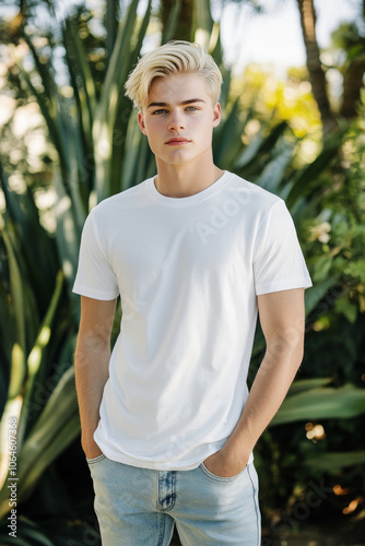 Vertical portrait of a young blond caucasian man wearing a blank white mockup t-shirt with copy space