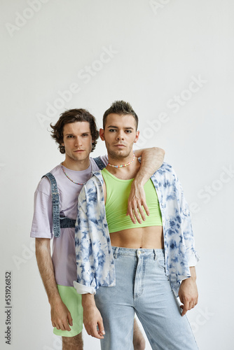 gay, man, pride, queer, fashion, outfit, beauty, couple, sex, identity, sex, right, androgyny, love, male, tie-dye, pastel, homosexual, young, 2, people, boy, masculinity, boyfriend, femininity, youth, dating, personality, confidence, individuality, style, white background, studio, adult, young adult, studio shot, photogenic