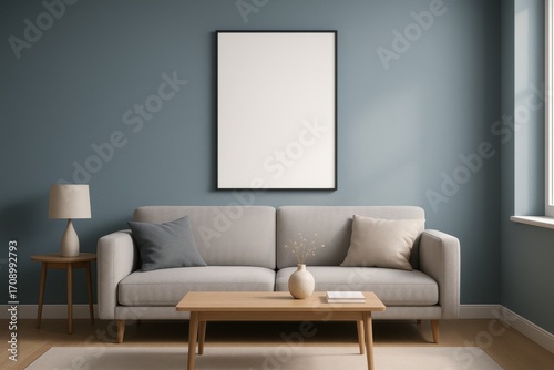 Vertical poster frame mockup on serene blue living room wall with stylish sofa soft light and shadows realistic scene for artwork presentation
