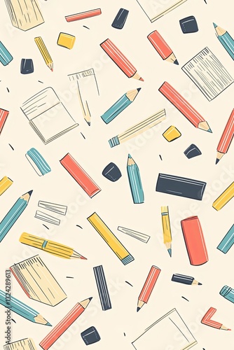 Vertical School supplies including pencils, erasers, and notebooks, simple seamless pattern.