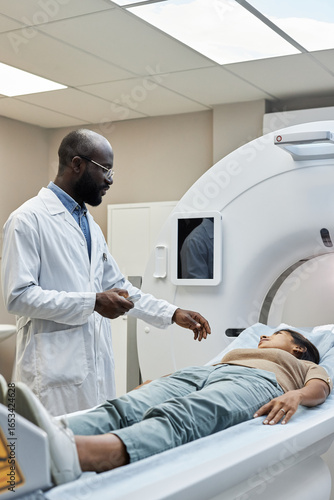 Vertical shot of African American radiographer and his female patient getting ready and starting MRI scanning in modern hospital