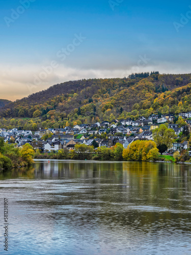 Vertical shot of Sehl village on Moselle river during autumn in Cochem-Zell district in Rhineland-Palatinate, Germany