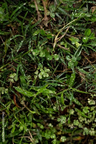 Vertical shot of the morning dew of clover leaves in the forest
