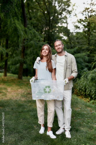 Vertical shot of young happy couple, eco volunteers holding recycle bin and looking at camera while collecting plastic waste together in the green forest