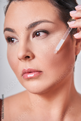 Vertical studio shot of natural woman in underwear with beauty serum promoting body positivity