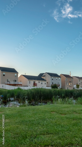 Vertical Sunset in the suburbs with multi storey homes ovelookinga park with shiny pond
