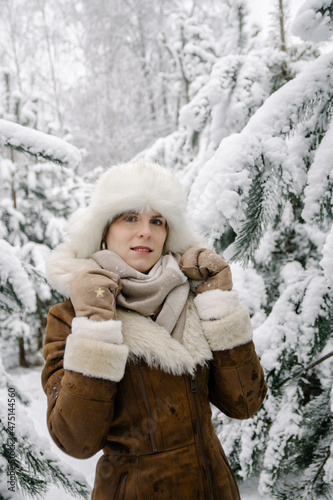 Vertical winter portrait of a smiling young european girl in a sheepskin coat, mittens, a white hat with earflaps and boots, who stands in snowy pine trees