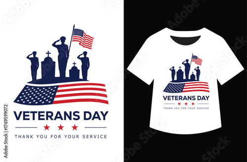 Veterans Day design: silhouetted soldier saluting the American flag. Text "VETERANS DAY" and "THANK YOU FOR YOUR SERVICE" shown on a design and a white t-shirt mockup. Patriotic tribute.