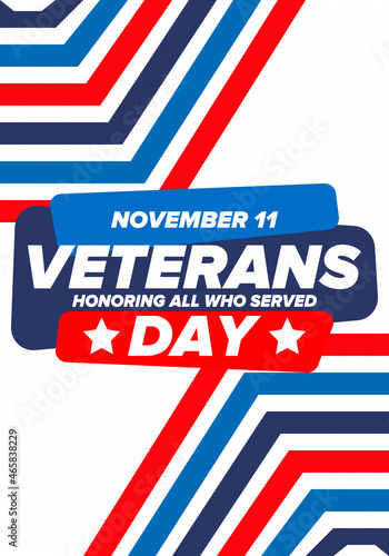 Veterans Day in United States. Federal holiday, celebrated annual in November 11. Honoring all who served. Patriotic american military concept. Poster, card, banner and background. Vector illustration