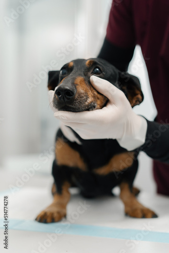 Veterinarian doctor makes a medical examination of a dachshund puppy dog on examination in a veterinary clinic. Old dachshund.