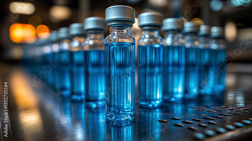 Vials of blue-colored vaccine liquid in a laboratory